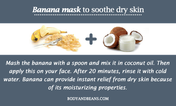 Mash the banana with a spoon and mix it in coconut oil. Then apply this on your face. After 20 minutes, rinse it with cold water. Banana can provide instant relief from dry skin because of its moisturizing properties. Due to the high level of fats present in coconut oil, it deeply conditions your skin, leaving it smooth and supple.