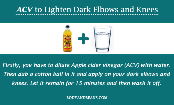 Apple cider vinegar (ACV) usage is another effective way of lightening the dark skin of your elbows and knees. The acidic content in it makes it an efficient bleaching agent that exfoliates and lightens the dark portions.