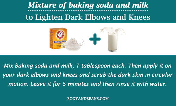 You need to mix baking soda and milk, 1 tablespoon each. Then apply it on your dark elbows and knees and scrub the dark skin in circular motion. Leave it for 5 minutes and then rinse it with water. This remedy is good for pigmentation and you can use it every alternate day to get rid of it.