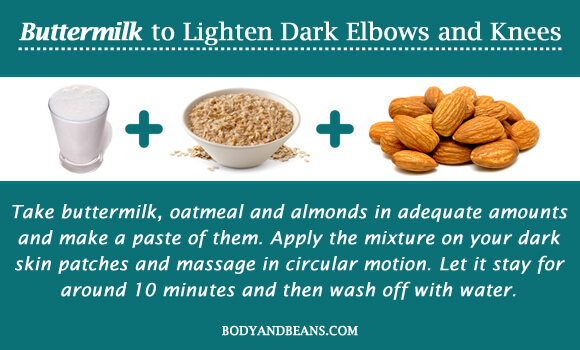 Buttermilk contains all the ingredients needed to whiten your dark skin. It contains the natural moisturizer milk, the bleaching agents vinegar and lemon and also salt, which is an exfoliating agent. Therefore, all these components together make buttermilk usage one of the best natural ways to lighten dark elbows and knees. Although buttermilk itself is very efficient, adding ground oatmeal and almonds to it will magnify the benefits. It will not only help you get rid of the dark patches but also make it soft and supple.