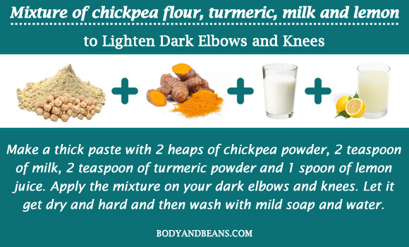 Make a thick paste with 2 heaps of chickpea powder, 2 teaspoon of milk, 2 teaspoon of turmeric powder and 1 spoon of lemon juice. Apply the mixture on your dark elbows and knees. Let it get dry and hard and then wash with mild soap and water. You can use this paste two times on a weekly basis for best results.