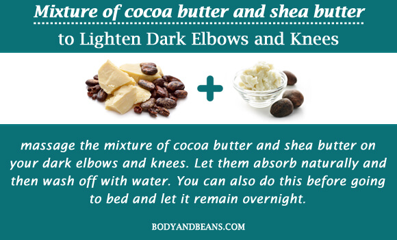 You need to massage the mixture of cocoa butter and shea butter on your dark elbows and knees. Let them absorb naturally and then wash off with water. You can also do this before going to bed and let it remain overnight. Frequent usage of this remedy will make your dark elbows and knees soft, smooth and glowing.