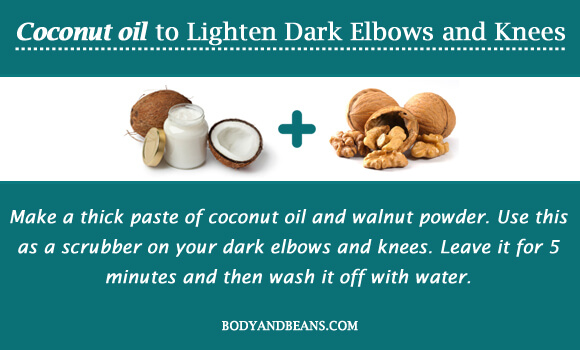 You can use only coconut oil or add walnut powder to it to enhance the good effect. At first, you need to make a thick paste of coconut oil and walnut powder. Use this as a scrubber on your dark elbows and knees. Leave it for 5 minutes and then wash it off with water. Alternatively, you can put coconut oil on your dark skin areas daily after taking shower as well as before going to bed.