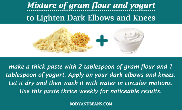 You have to make a thick paste with 2 tablespoon of gram flour and 1 tablespoon of yogurt. Apply on your dark elbows and knees. Let it dry and then wash it with water in circular motions. Use this paste thrice weekly for noticeable results.