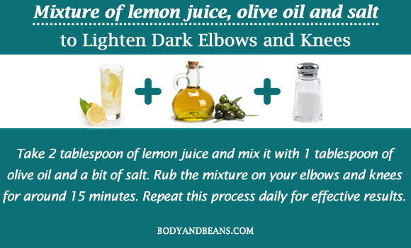 You need to take 2 tablespoon of lemon juice and mix it with 1 tablespoon of olive oil and a bit of salt. Rub the mixture on your elbows and knees for around 15 minutes. Repeat this process daily for effective results. However, avoid this remedy if you have any cut or injury on your elbows and knees.