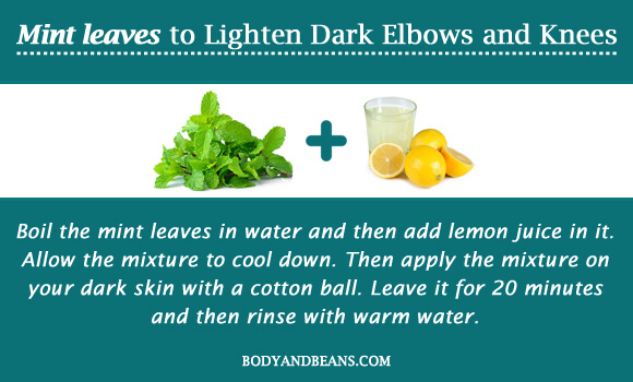 The anti inflammatory and antiseptic property of mint leaves is very good for your skin. It heals your skin and lightens the skin tone by fading all the scars and dark spots. Adding lemon juice to it makes the mixture ideal for lightening your dark elbows and knees.