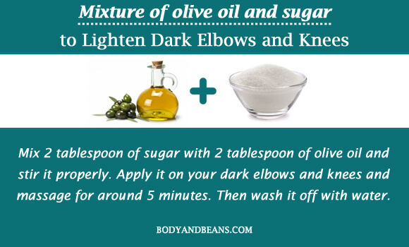 You need to mix 2 tablespoon of sugar with 2 tablespoon of olive oil and stir it properly. Apply it on your dark elbows and knees and massage for around 5 minutes. Then wash it off with water. You can use this method every alternate day to get maximum benefits.