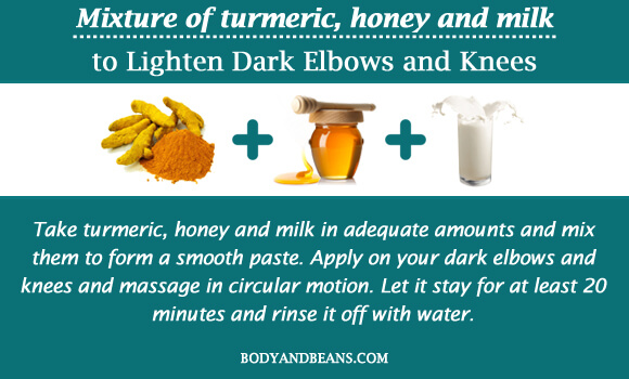 You need to take turmeric, honey and milk in adequate amounts and mix them to form a smooth paste. Apply on your dark elbows and knees and massage in circular motion. Let it stay for at least 20 minutes and rinse it off with water. Repeat this process weekly in order to lighten your elbows and knees faster.
