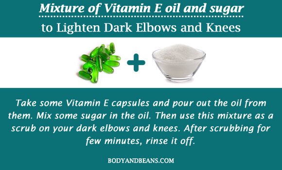 You need to take some Vitamin E capsules and pour out the oil from them. Mix some sugar in the oil. Then use this mixture as a scrub on your dark elbows and knees. After scrubbing for few minutes, rinse it off. This remedy can be used every alternate day for best results.