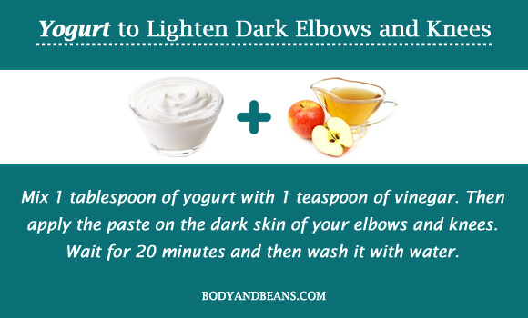 You can use yogurt to get rid of the darkness of your elbows and knees. This is because yogurt nourishes your skin and cleanses all the dirt and impurities out of the pores. It also removes the dead skin cells and hence prevents skin darkening. Addition of vinegar in it enhances the good effects and fights pigmentation issues.