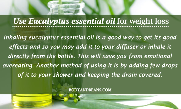 Inhaling eucalyptus essential oil is a good way to get its good effects and so you may add it to your diffuser or inhale it directly from the bottle. This will save you from emotional overeating. Another method of using it is by adding few drops of it to your shower and keeping the drain covered. This will immediately refresh you and make you ready for your weight loss plan.